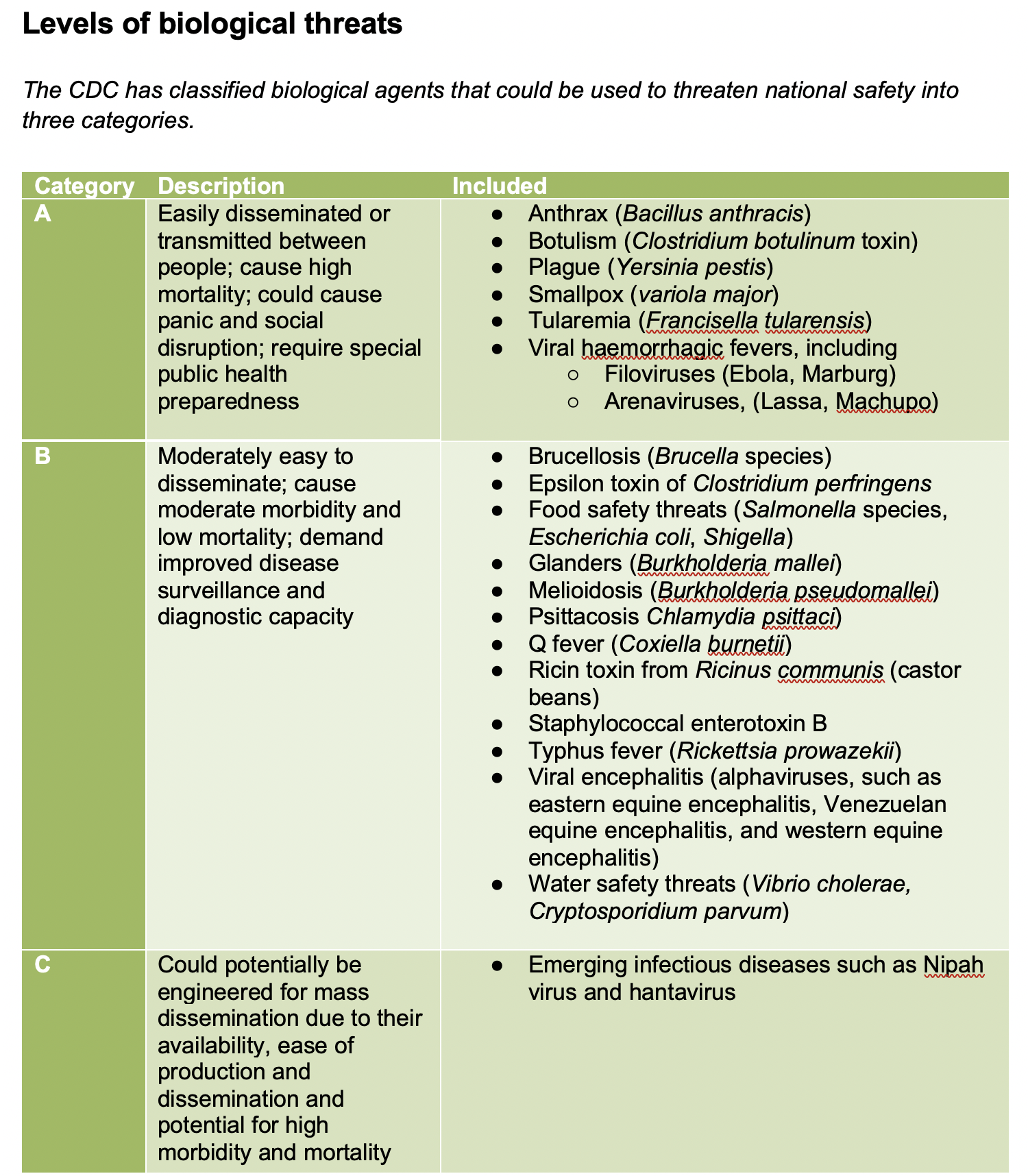 It is highly stable in aerosolized form making it one of the most popular biological weapons choices. High-priority agents include organisms that pose a risk to national security because they. What is the biggest act of bioterrorism known to date. Anthrax has been used in bioterrorist attacks in the past with the most prolific example being the Anthrax letter attacks in the United States in 2001.
